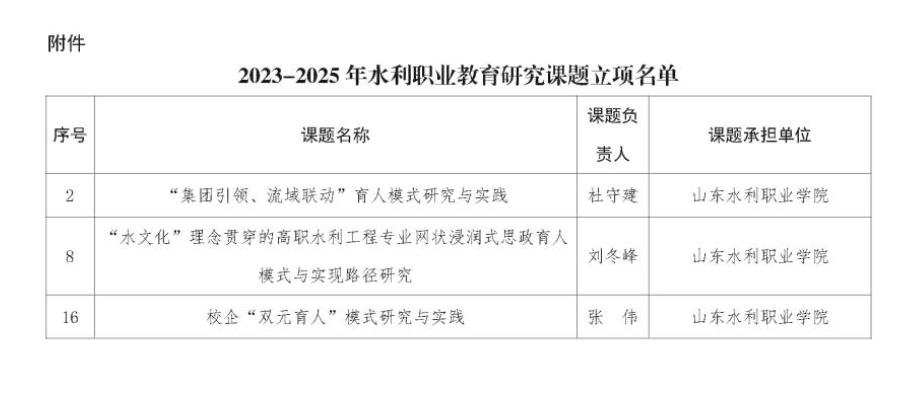 近日,水利部人事司、全国水利职业教育教学指导委员会、中国水利教育学会公布了《2023-2025年水利职业教育研究课题立项名单》,学院申报的《“集团引领、流域联动”育人模式研究与实践》《“水文化”理念贯穿的高职水利工程专业网状浸润式思政育人模式与实现路径研究》和《校企“双元育人”模式研究与实践》3项研究课题获批立项。