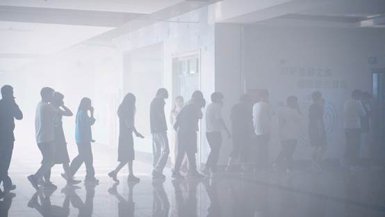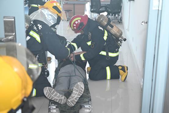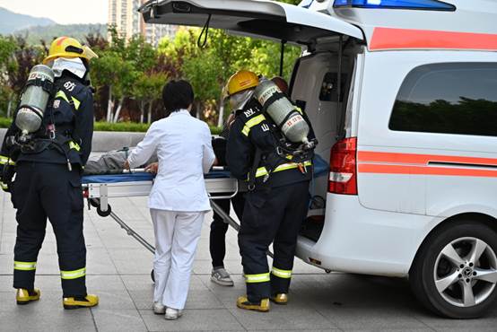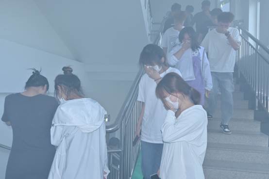 首先是火灾应急演练,活动开始前由专业人员向大家讲解了疏散逃生的方法及注意事项。模拟火情发生,消防控制室值班人员发现烟感探测器报警,保安巡逻人员现场确认火灾位置,学院专业应急小组及时出动进行火灾扑救和人员疏散。疏散引导组在出入口及楼梯处打开疏散通道门、引导人员迅速撤离现场。疏散过程中清查到有未撤出人员,确认火场中还有1名人员被困。防护救护组向及时赶到的消防救援队汇报被困人员位置,救援小组进入楼内成功营救出被困人员,演练圆满结束。