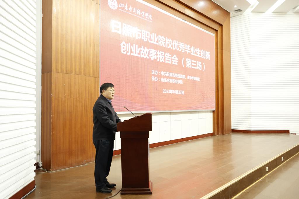 迟令席在致辞中指出,“日照市职业院校优秀毕业生创新创业故事报告会”活动,是由日照市委统战部和市中华职教社统一筹划、组织安排的品牌活动。各校优秀毕业生在各自的工作岗位上都取得了不菲的成绩,他们爱岗敬业、执着追求、不懈奋斗,为在校学生树立了标杆和榜样。他向青年学子提出三点希望:一要有立志成才的信心和决心,二要锤炼增长才干的态度和本领,三要争做最美职校青年的引领者和创造者。