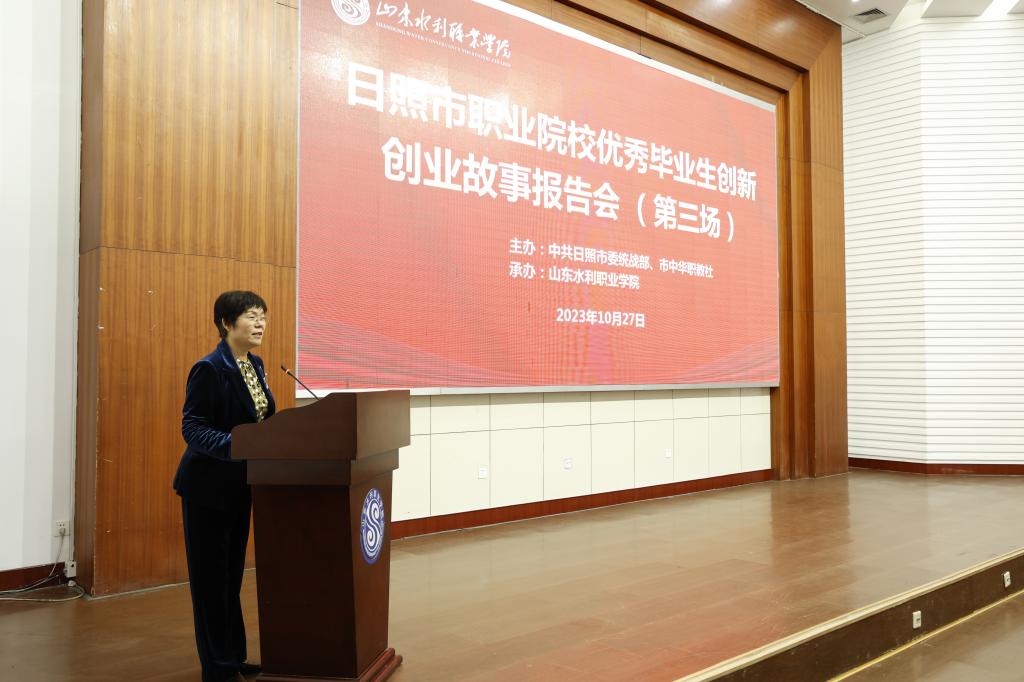 10月27日,由中共日照市委统战部、市中华职教社主办,学院承办的日照市职业院校优秀毕业生创新创业故事报告会(第三场)在学术报告厅举行。日照市委统战部副部长、市侨办主任迟令席,学院党委委员、副院长、统战部部长颜秀霞出席活动。学院2021届优秀毕业生彭建辉作题为《创新破浪正当时 勇立潮头敢为先》的报告。统战部、学生工作处相关人员及学生代表共350余人参加了报告会。报告会由颜秀霞主持。