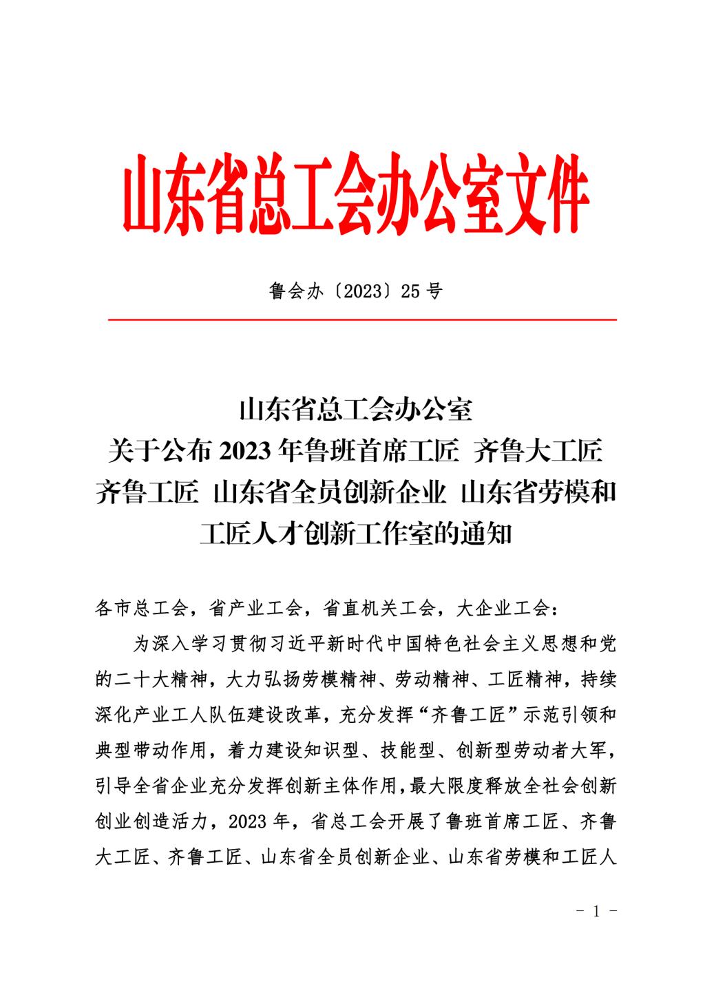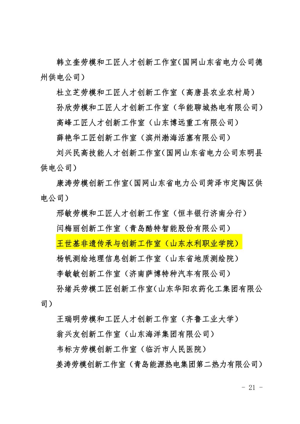 11月14日,山东省总工会发布《关于公布2023年鲁班首席工匠 齐鲁大工匠 齐鲁工匠 山东省全员创新企业 山东省劳模和工匠人才创新工作室的通知》,学院“王世基非遗传承与创新工作室”入选2023年度山东省劳模和工匠人才创新工作室。