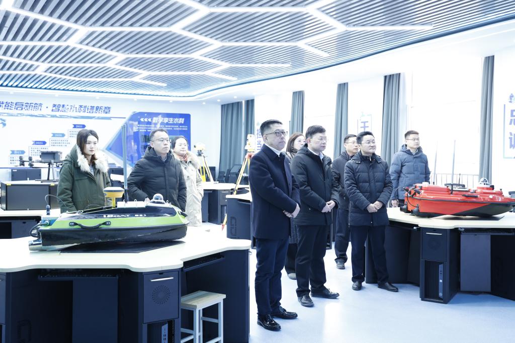 郑振豹一行先后参观了智慧水利实训基地、数字摄影测量实训室、无人机飞行学院、割绒纳绣非遗传承工作室等校内实训场所,并对学院的实训条件、社会服务等情况表示赞赏。