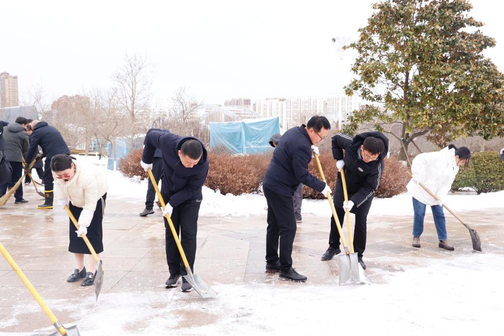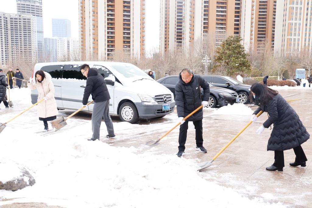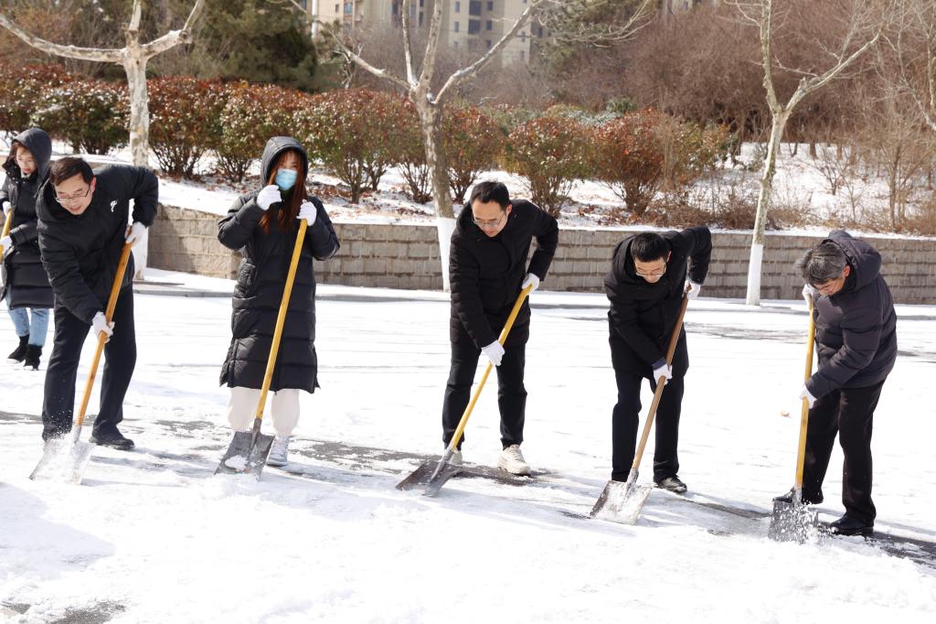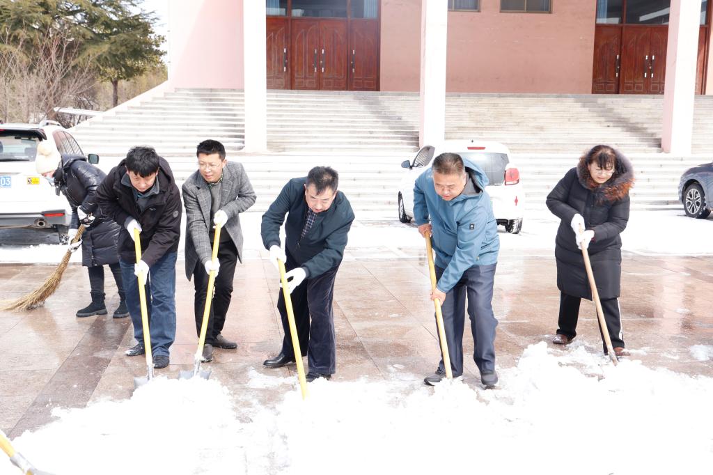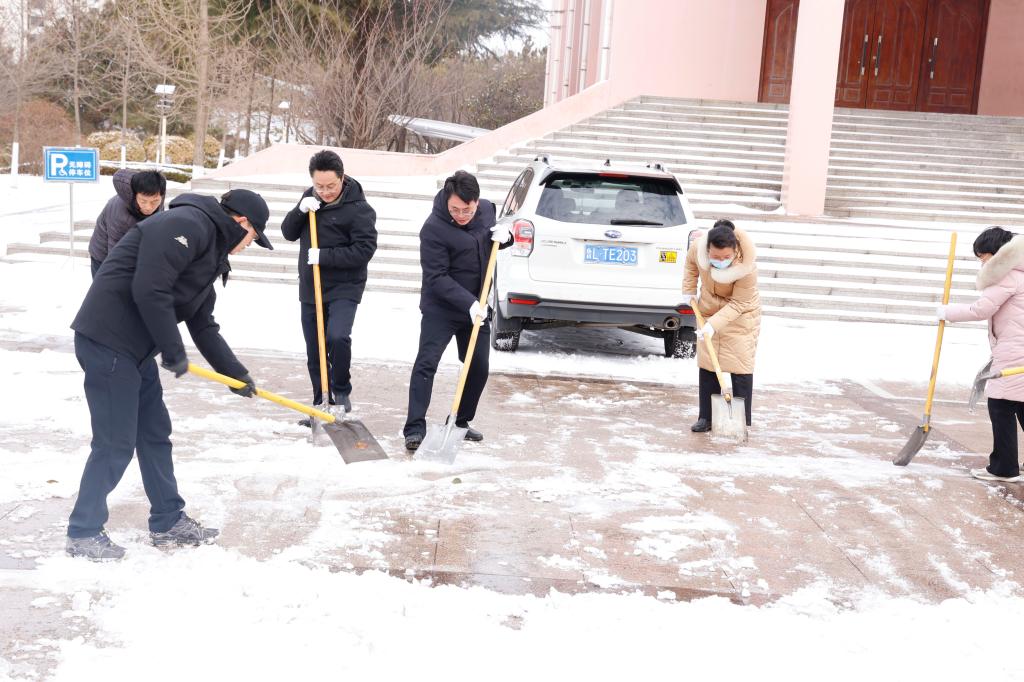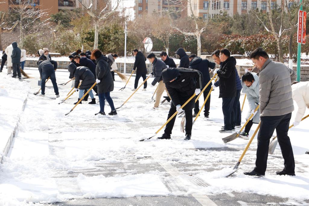 在除雪现场,学院党委书记王维、党委副书记、院长杨敬涛拿起铁锹,带领全院副科级以上干部在校园道路上共同铲雪除冰,全力保障校园道路畅通。大家齐心协力、相互配合,有的用扫帚扫除路面上的积雪,有的用铁锹铲去地面上的冰层,在抢通保畅、恢复学院秩序中勇担当、做表率。