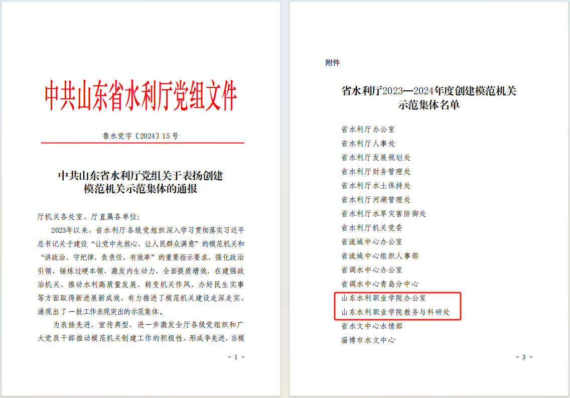 近日,中共山东省水利厅党组印发《关于表扬创建模范机关示范集体的通报》,对20个集体予以通报表扬,学院办公室、教务与科研处榜上有名。