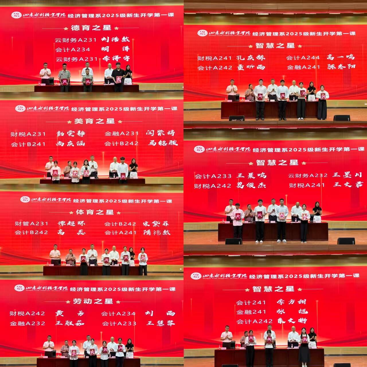 副主任孔田甜宣读了《经济管理系2024-2025学年五育之星表彰名单》,激励所有新生学习先进、争做先进。与会领导老师分别为“德育之星”“智慧之星”“体育之星”“美育之星”“劳动之星”等先进典型颁发荣誉证书。