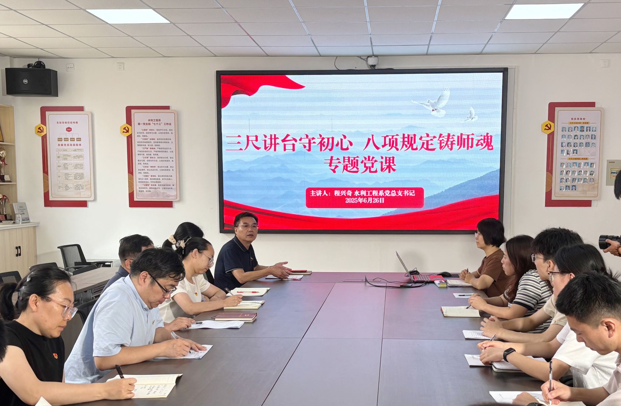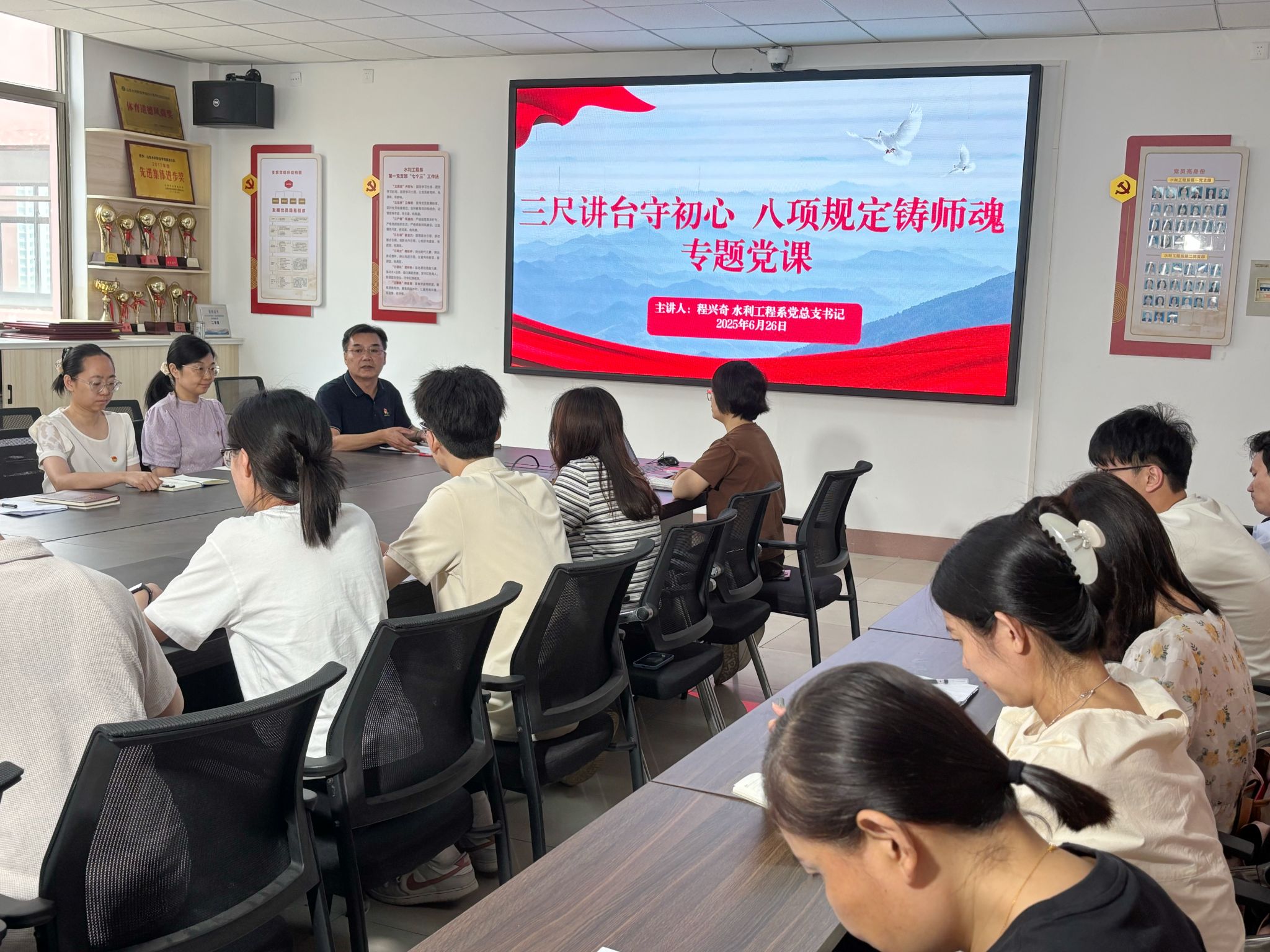 为深入贯彻中央八项规定精神,强化党员教师责任担当,6月26日,水利工程系党总支书记程兴奇以“三尺讲台守初心 八项规定铸师魂”为主题,为全系党员教师带来了一堂内容丰富、意义深刻的专题党课。