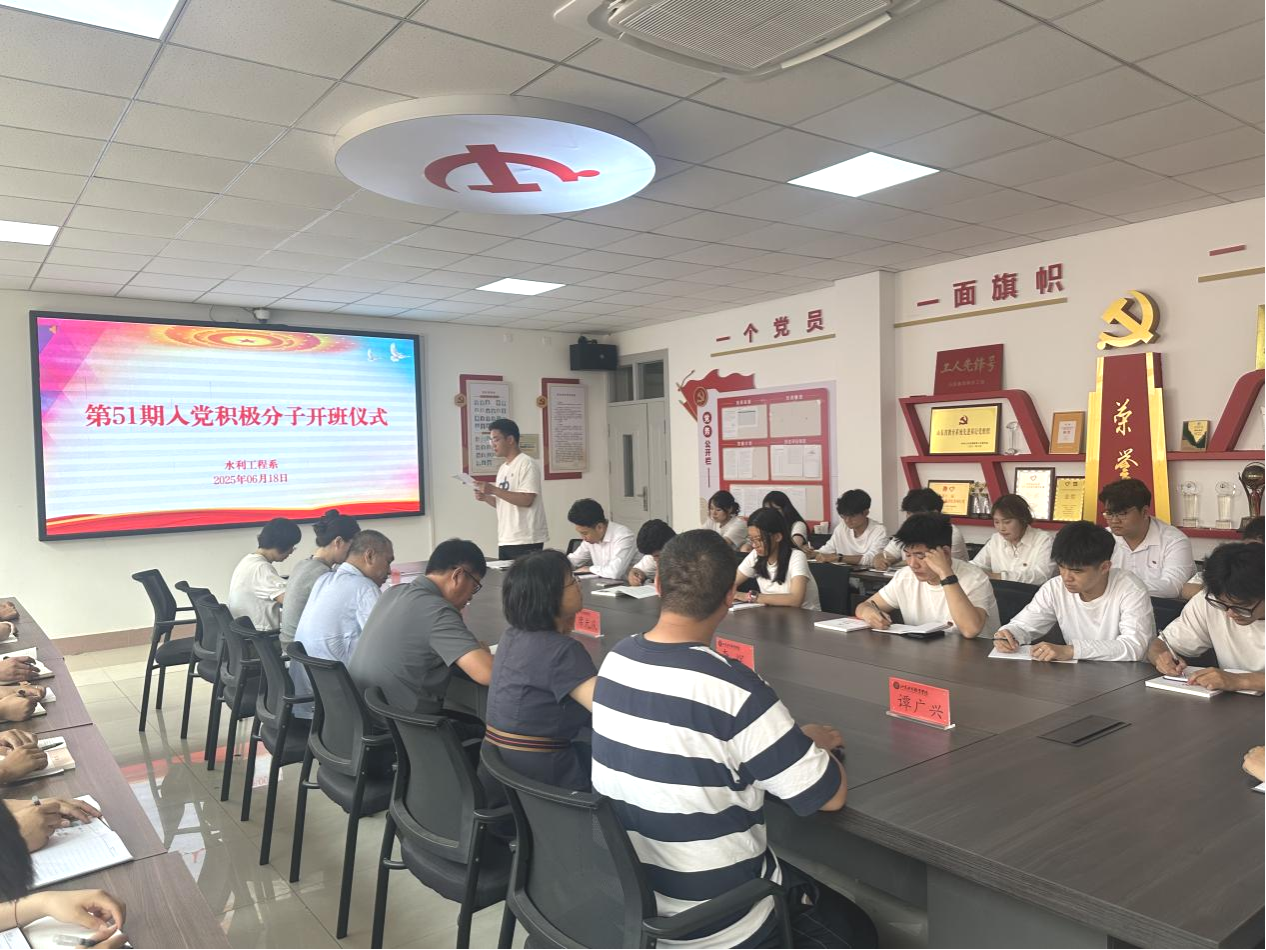 6月18日下午,水利工程系第51期入党积极分子培训班开班仪式在纳贤楼7210会议室隆重举行。活动由水利工程系党总支宣传委员李辉主持,全体入党积极分子参加。