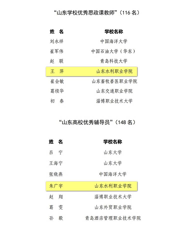 近日,中共山东省委教育工委公布了2024年度山东“十佳百优”学校思政课教师和高校辅导员评选结果,学院思想政治课教学部教师王萍获评“山东学校优秀思政课教师”,资源与环境系辅导员朱广宇获评“山东高校优秀辅导员”。双荣誉的取得,不仅是对两位教师个人工作的高度认可,更彰显了学院在思政教育与学生管理工作中的坚强实力。