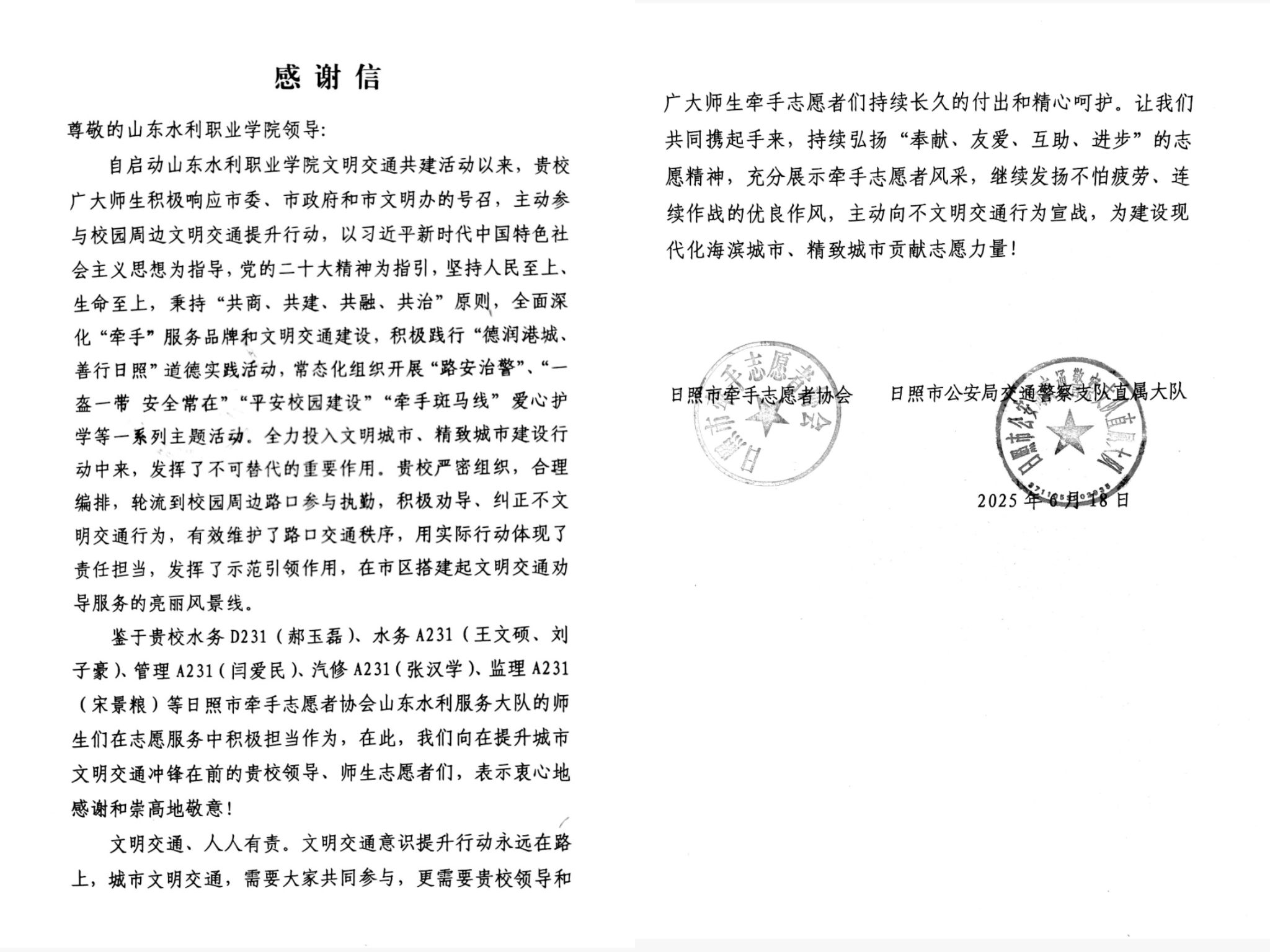 近日,日照市牵手志愿者协会与日照市公安局交通警察支队直属大队联合向学院发来感谢信,对学院师生在文明交通共建活动中作出的突出贡献给予高度认可与诚挚感谢。