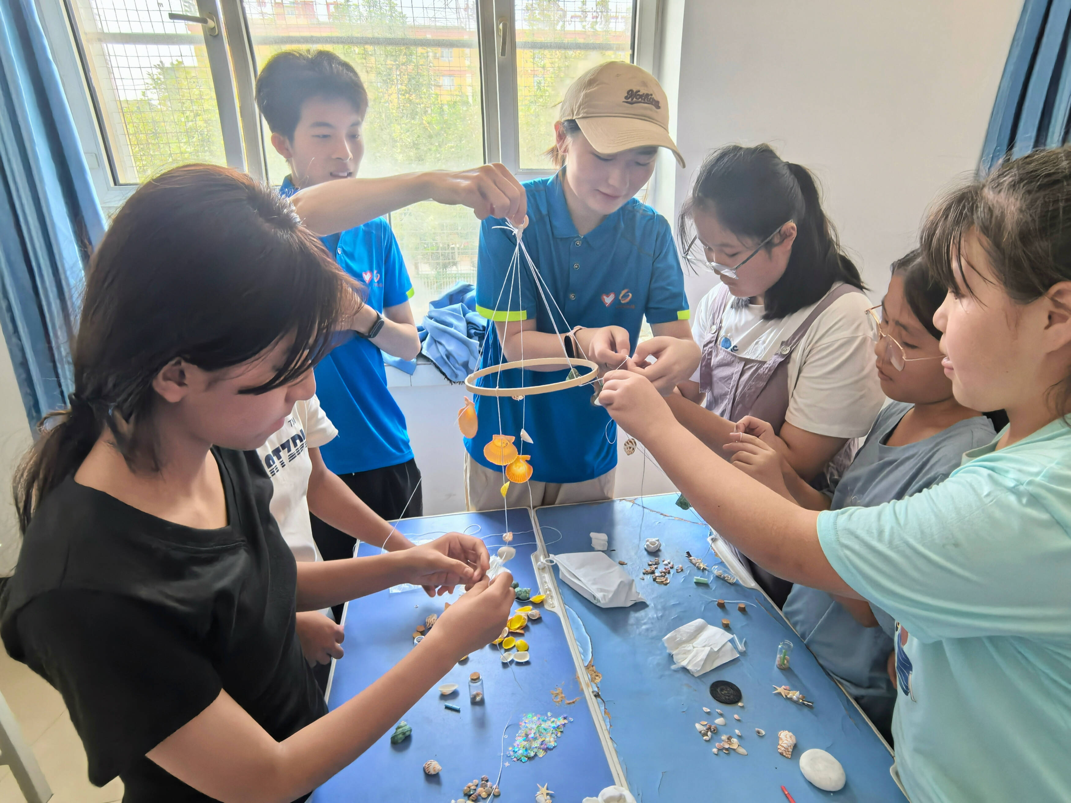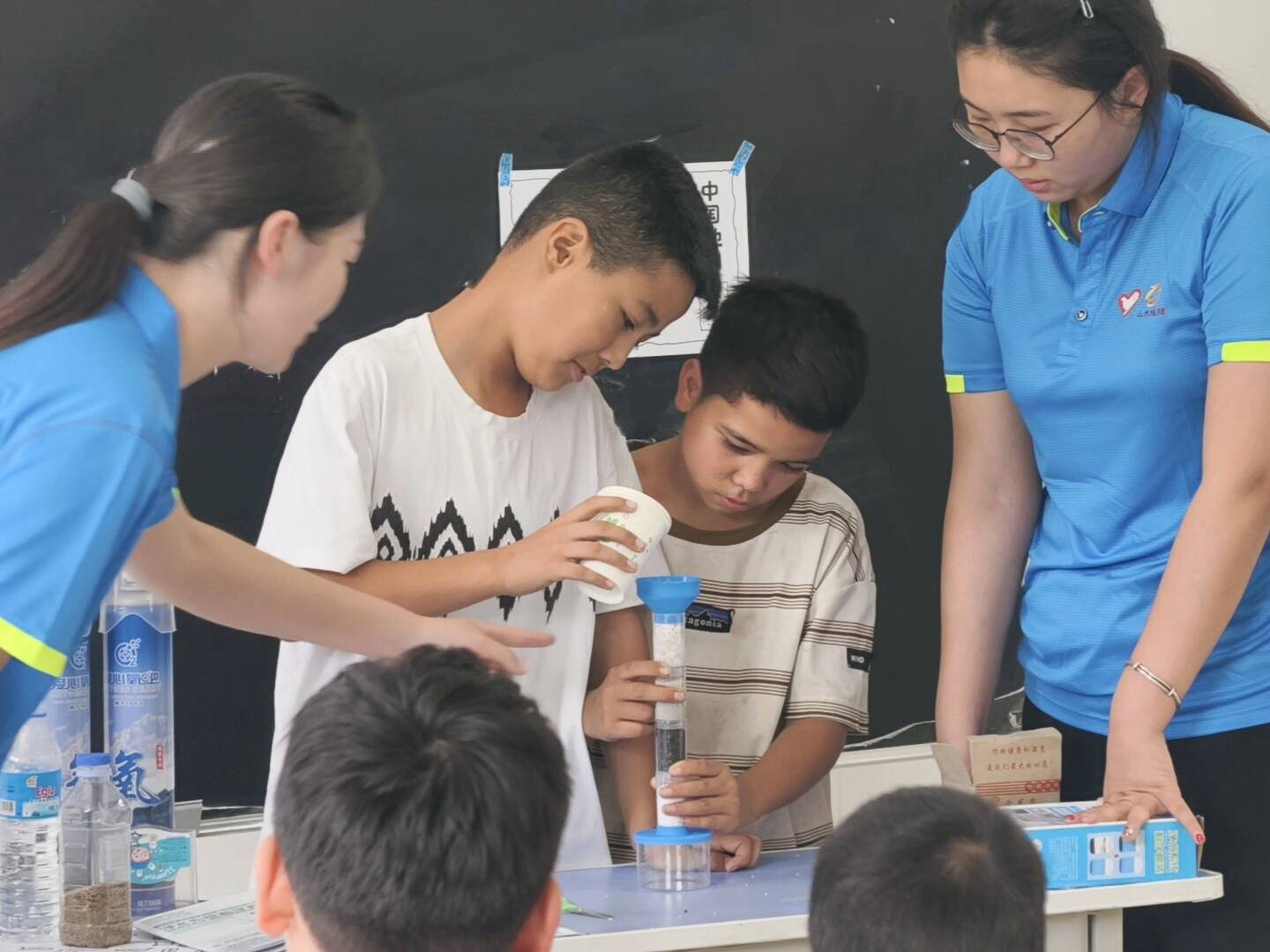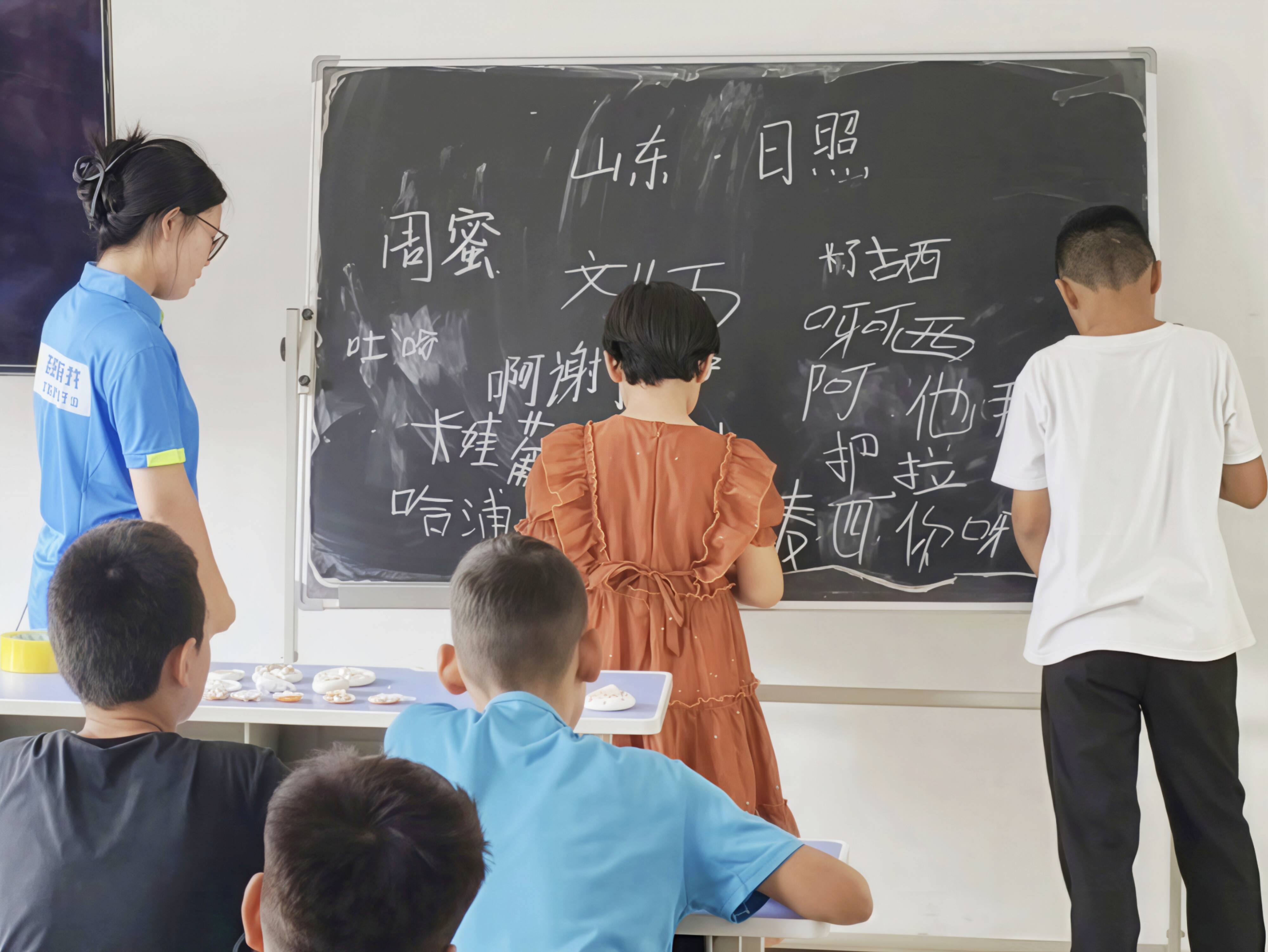 本次支教活动紧密围绕“铸牢中华民族共同体意识”主题,聚焦喀什地区青少年成长发展需求,精心构建了融合民族团结教育、红色教育、文化传承、知识启蒙与身心健康、普通话推广等多元课程体系。在麦盖提县阳光社区,志愿者们开展了丰富多彩的教学活动:诵读红色经典、讲述国防故事,厚植爱国情怀,感悟红色文化精神;通过“海洋礼物”亲身体验与共绘山海画卷,架起鲁疆情感桥梁;书法课堂上,孩子们在一笔一划中感受传统文化温度;非遗扎染体验中,扎缚技法与绚丽图案激发创造力,体验传统技艺魅力;“节水小课堂” 结合专业实例与动手实验,传递节水护水理念,激发探索自然热情;地理“鲁疆大发现”与国家地图拼图,深化国情认知,感受祖国辽阔与多元;科学启蒙融入生活常识与安全知识,筑牢成长防线;体育课堂上的羽毛球活动,让孩子们在奔跑跳跃、协作挥拍中释放活力,收获成长快乐。此外,志愿者们还结合语言学习需求开展普通话提升与趣味俄语启蒙,助力孩子们巩固知识、提升能力。活动尾声的“童心向党”文艺汇演上,孩子们深情演绎爱国歌曲,挥舞国旗告白祖国,将民族团结的种子深植心田。系列活动通过丰富课程滋养心灵、启迪成长,取得扎实成效。