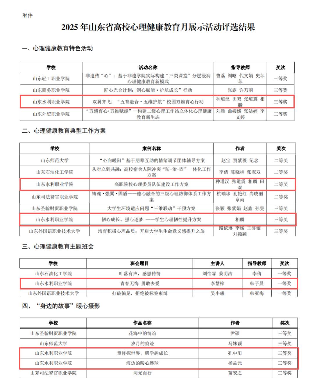 近日,由山东省高等学校思想政治教育研究会大学生心理健康教育专业委员会主办的“2025年山东省高校心理健康教育月展示活动”评选结果正式公布。学院在心理健康教育特色活动、典型工作方案、主题班会及“身边的故事”暖心摄影四大类别中共斩获6项荣誉。