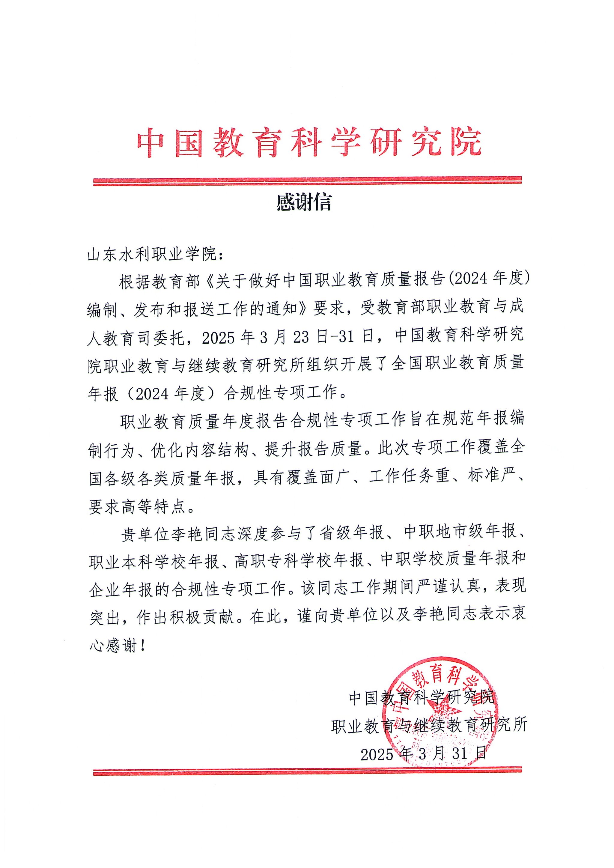 中国教育科学研究院在感谢信中特别指出:"李艳同志工作期间严谨认真,表现突出,作出积极贡献。”体现了对我校教师专业素养的充分肯定。信息工程系将以此为契机,继续深化教育教学改革,强化师资培养,为学院职业教育高质量发展作出更大贡献。