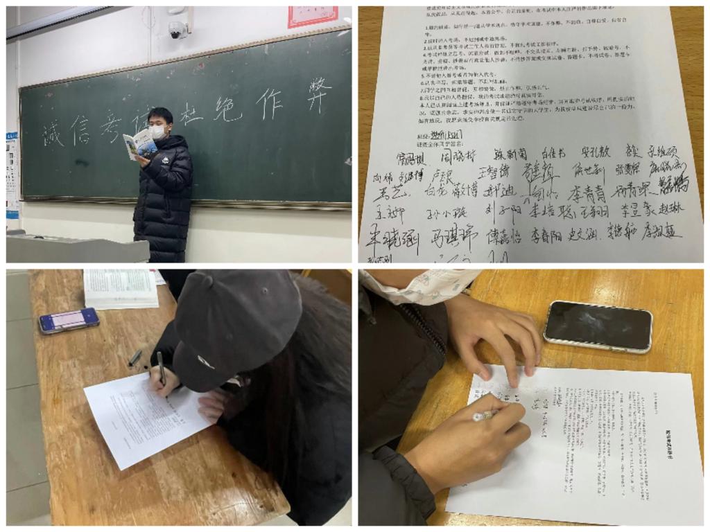 五、签订一份“诚信考试承诺书”。同学们在承诺书上郑重的签下自己的名字,并表示,在期末考试中,一定会用真实的成绩证明自己的实力,展现过硬的知识水平和道德水平。